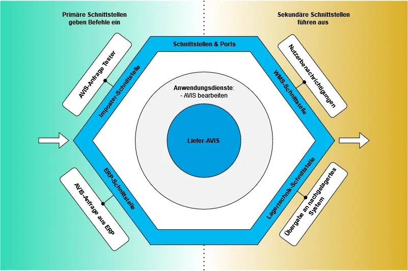 In order to keep the flexibility and adaptability of the system as high as possible, the use of the software design principle of ‘hexagonal architecture’ is recommended. It separates the business from its technical requirements. In this way, the business modules can be tested independently of databases, web servers or other technical interfaces. The connected elements such as user interfaces can be changed or exchanged at any time while accessing the same building blocks.